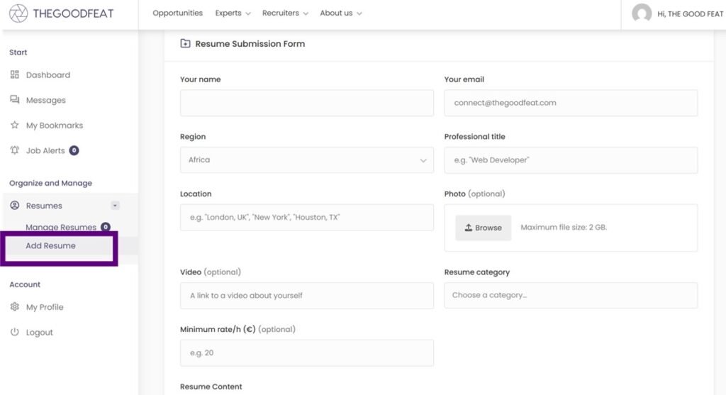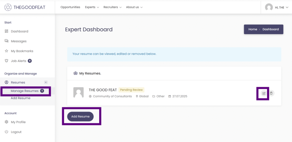 Depuis l’Expert Dashboard, cliquez sur Add Resume
